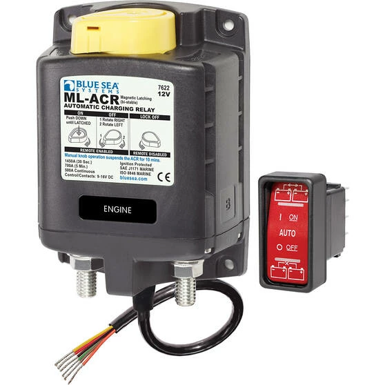 The ML-ACR 12V Automatic Charging Relay with Manual Control is a 500 Amp magnetic latching (bi-stable) relay which automatically combines batteries during charging and isolates batteries when discharging and when starting the engine. The manual control switch provides an added level of safety allowing control with or without power, and offering LOCK OFF capability for servicing. The relay allows paralleling of battery banks for emergency starting. It has a LED output to remotely indicate when batteries are combined, isolated, in voltage lockout, or in Start or Engine isolation (requires optional LED). Includes ML-Series Remote Control Contura Switch.