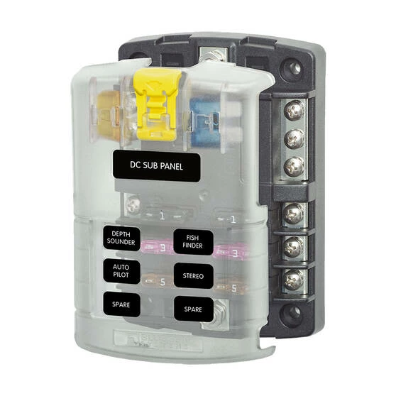 Provides a covered, surface mount circuit consolidation and protection using ATO or ATC (blade) fuses (sold separately). Circuits all feature the same source for easy master switching. Clear insulating cover allows storage of spare fuses, and Features an easy to open, push button latch. Fuses not included.