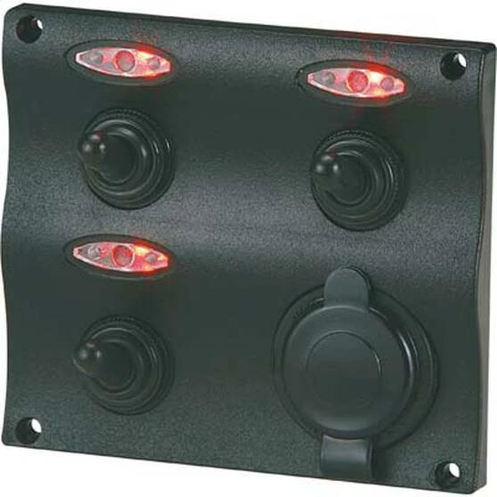 The Blueline 3 Gang Panel With Socket is a gang panel that is made of a hard ABS plastic that is reinforced at the corners to resist cracking. Complete with water resistant switches and gaskets, as well as a very handy 12V cigarette lighter style socket. The switches feature red LED lights when in use and is backed up with 20A switches and 15A fuses to ensure safety. A very clean-looking and easy to use gang panel that is ideal for use in any boat. For the full range of switches, gang panels, rocker switches and toggle switches available at BCF, call in store and talk to one of our friendly, knowledgeable staff to find the one that’s right for you.
